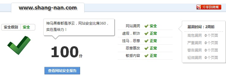 三、網(wǎng)站木馬檢測(cè)方法網(wǎng)站木馬檢測(cè)方法我們推薦使用360網(wǎng)站安全檢測(cè)工具,在網(wǎng)上搜索下“360網(wǎng)站安全檢測(cè)工具”,打開(kāi)網(wǎng)站,輸入您的網(wǎng)址就可以檢測(cè)了,方法非常的簡(jiǎn)單、易用,不需要專業(yè)人士的指導(dǎo)就可以檢測(cè)出網(wǎng)站的健康狀況。檢測(cè)分?jǐn)?shù)一定要在85分以上才算可以,我們的網(wǎng)站檢測(cè)分?jǐn)?shù)都是100分。