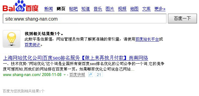 這個(gè)情況就說(shuō)明百度對(duì)你的網(wǎng)站所有內(nèi)頁(yè)的百度快照給予了刪除操作,如果您的網(wǎng)站以前收錄是正常的而現(xiàn)在卻只剩下首頁(yè)有收錄了,那么就可以判斷出,你的網(wǎng)站在最近一個(gè)月內(nèi)有違規(guī)操作或者是其他比較嚴(yán)重的相關(guān)問(wèn)題,如下圖: