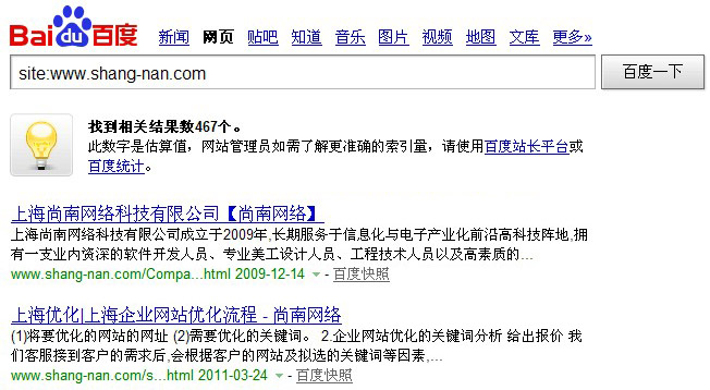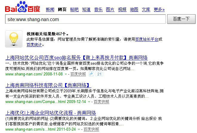 第一、首先通過(guò)site:指令來(lái)查詢(xún)網(wǎng)站收錄變化,比如說(shuō)你的網(wǎng)址是m.jgw656.com,就在百度里搜索“site:m.jgw656.com”來(lái)查詢(xún)你的網(wǎng)站收錄情況,site指令查詢(xún)結(jié)果主要有以下幾種情況: